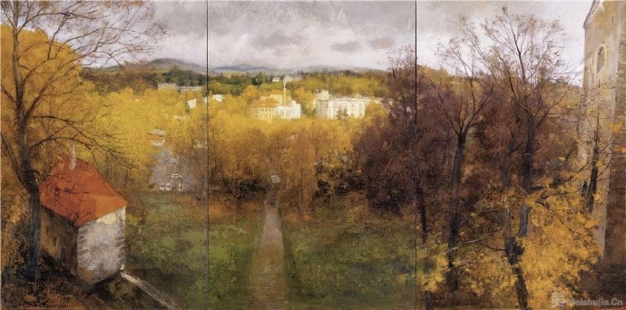 《无名小镇》系列中树木在风中摇曳的状态带着柯罗的痕迹,《秋色连波》系列中师法莫奈描绘荷塘中光影的斑斓……多位风景画大师最具辨识度的细节元素汇集到一起,结合他独立的个人视角,呈现出他心中的东欧印象。