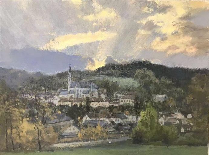 欧洲夕阳下映射在湖面那淡淡的紫、捷克境内普遍的红砖色系屋顶与秋色那“奇妙的和谐” 、晴朗天空下的蓝色多瑙河——庄重将这些转瞬即逝的瞬间都用画笔详尽地记录下来,并渲染出专属于自己的色调与记忆中的感觉。