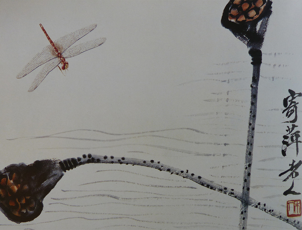 作品中,运用浓重的笔墨写出了一纵一斜两条交叉的主线,就使整个画面大局已定,完成了秋思的意蕴。沉着的莲蓬和轻盈的红色蜻蜓,形成了强烈的对比,使画面生机盎然的景象顿时跃然纸上。 在此作品中,白石先生运用篆书的手法,让整个画面充满了节奏感,给作品平添了许多意趣,笔墨的酣畅淋漓和独具魅力的笔墨意味,才使这样十分简单的构图生成了独特的艺术价值。