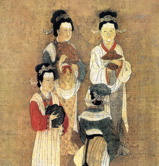 此图表现“十六罗汉”中的“坐 鹿罗汉”。他端坐于方椅之上,左手抚膝,右手作说法状。前有一鹿,另有一身着红衣的侍者,扭头施舍于一贫者。背景画有山石松树。此画设色浓艳,描绘细致, 前景和背景对比鲜明。