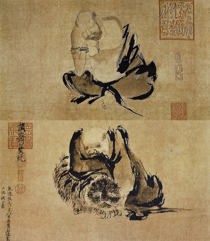 石恪画风笔墨放逸,不专规矩。此图表现禅宗二祖慧可和丰干祖师调心参禅的情景。画卷中,慧可双足盘坐于地,托腮沉思冥想,另一幅画丰干伏于虎背。作品以强劲飞动和毫不经意的草草逸笔表现出高僧微妙深邃的禅境,开大写意人物之先河,对南宋梁楷及减笔人物画颇有影响。