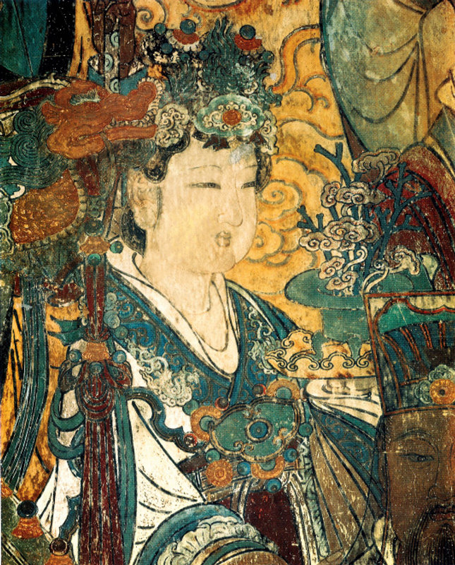 天皇大帝左侧,一位玉女头戴花冠、身着长衫、面露微笑,手捧珊瑚、如意、宝瓶,作侍奉状。因年久铅粉变色面部色泽不匀。