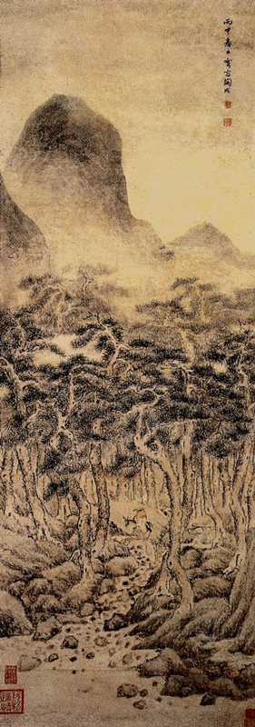 此图绘高山远峰,松林郁葱,林间溪水淙淙,小桥横列 ,有人策马缓行于桥上,后有仆人挑担随从。用笔苍郁,意境幽远。