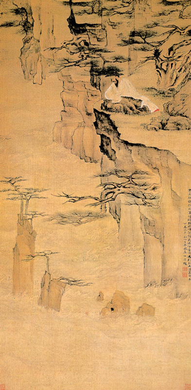 此图画悬崖巨石临江,其上苍松盘曲凌空,波浪翻滚拍打岩石,作者坐卧石中,俯视江面,神态可掬。