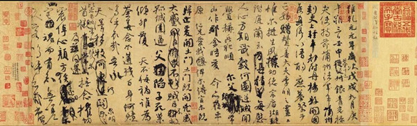 怀素和尚的《自叙帖》,也是十年未见的藏品。它是怀素流传下来篇幅最长的作品,通篇为狂草,人称“天下第一草书”。怀素学书法以勤奋著名,曾经游历京师,向颜真卿等高手请教。公元777年,怀素摘录部分他人赠诗并且自叙生平大略,写成《自叙帖》。《自叙帖》在宋代相传有三本,展览中展出的台北故宫藏本是现今仅存的一卷,历经各朝各代的公私收藏,在乾隆皇帝时收入清宫,定为“神品”。